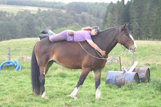 After having so much fun I dismount and give Solly a nice treat of a licorice lick. I groom him and set him free in the grazing part of the field with Stormy and Holly and then go back for Tara who has been in one of the round pens all this time and ride her bareback up to the top of the field for their dinner. It's been a fabulous day with lots of new things done and old things remembered ;)